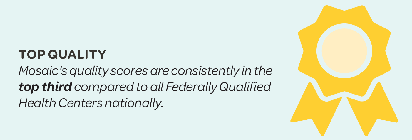 As a nonprofit Community Health Center, also known as a Federally Qualified Health Center (FQHC), Mosaic is part of a network of 1,400 independent organizations across the country who provide vital healthcare services to underserved populations. We receive grant funding from the federal government and other sources to provide a critical safety net for community members irrespective of their income or insurance status.
